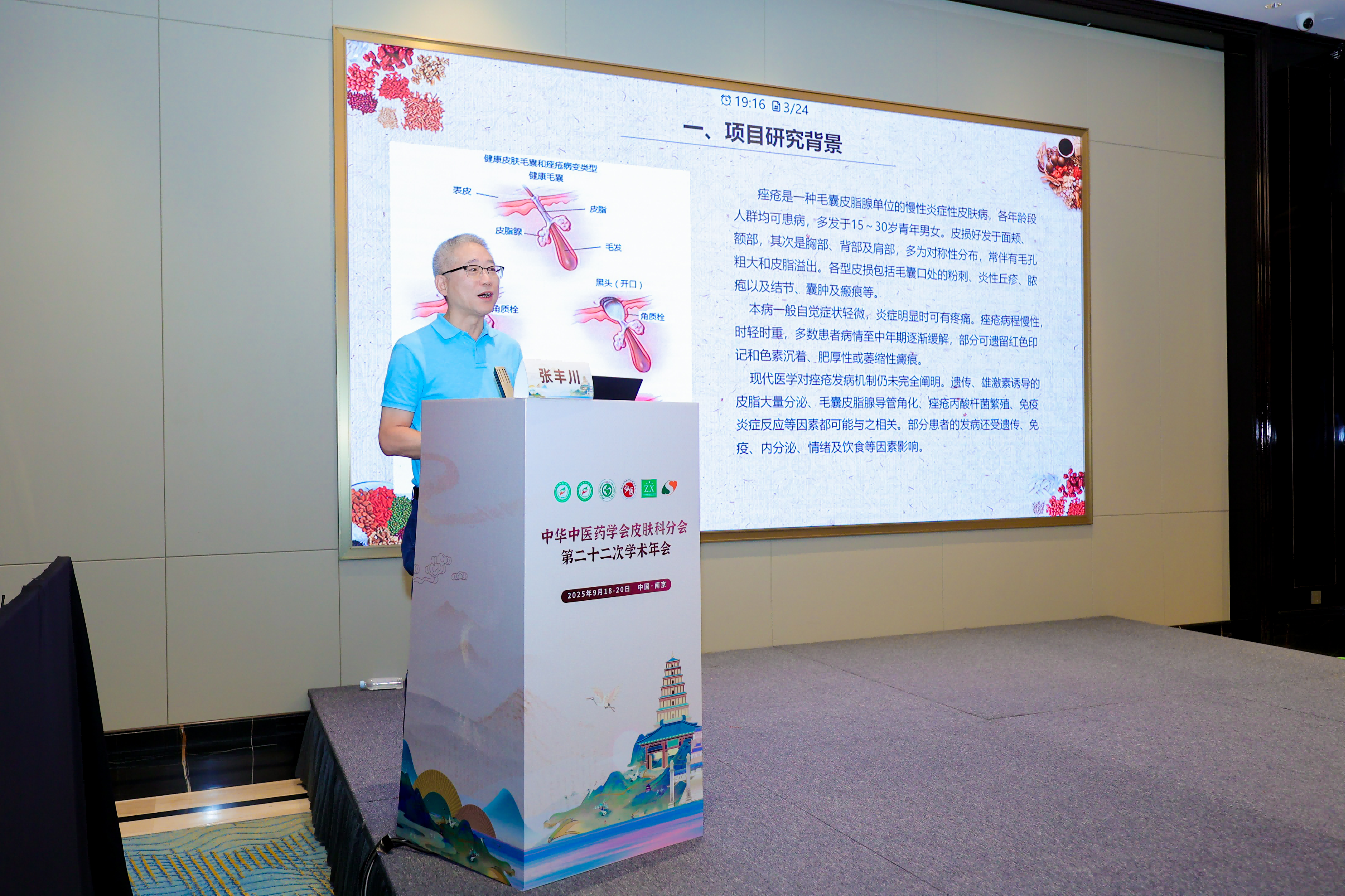 在20日上午痤疮分会场上,北京中医药大学东方医院张丰川教授以专题分享的形式介绍了由武汉市重点研发计划支持、东方医院牵头组织、全国多家省级中医院共同参与的“龙珠软膏治疗中度寻常型痤疮的随机、盲法、阳性对照、多中心临床研究”。